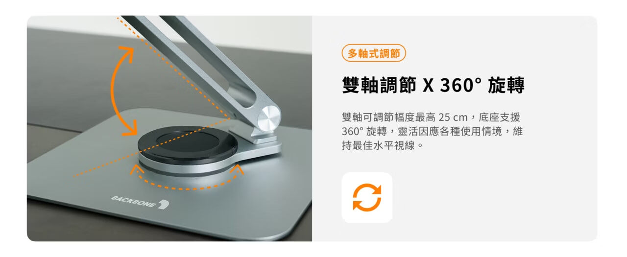 •雙軸高度及角度調節 x 底座360°旋轉,輕鬆維持人體工學坐姿。