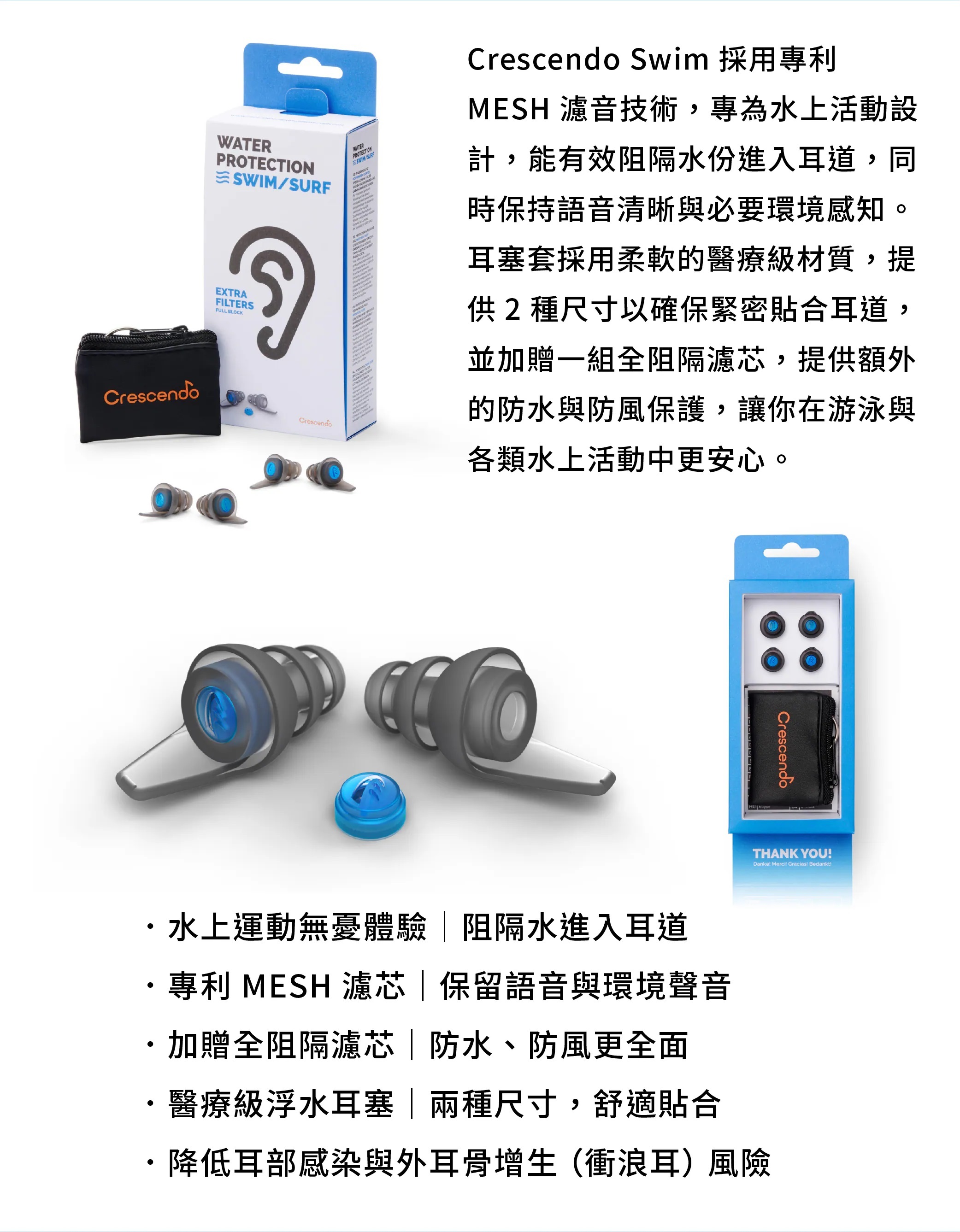 Crescendo Swim / Surf 防水高保真隔音降噪耳塞 (游泳 / 水上活動專用,荷蘭製)