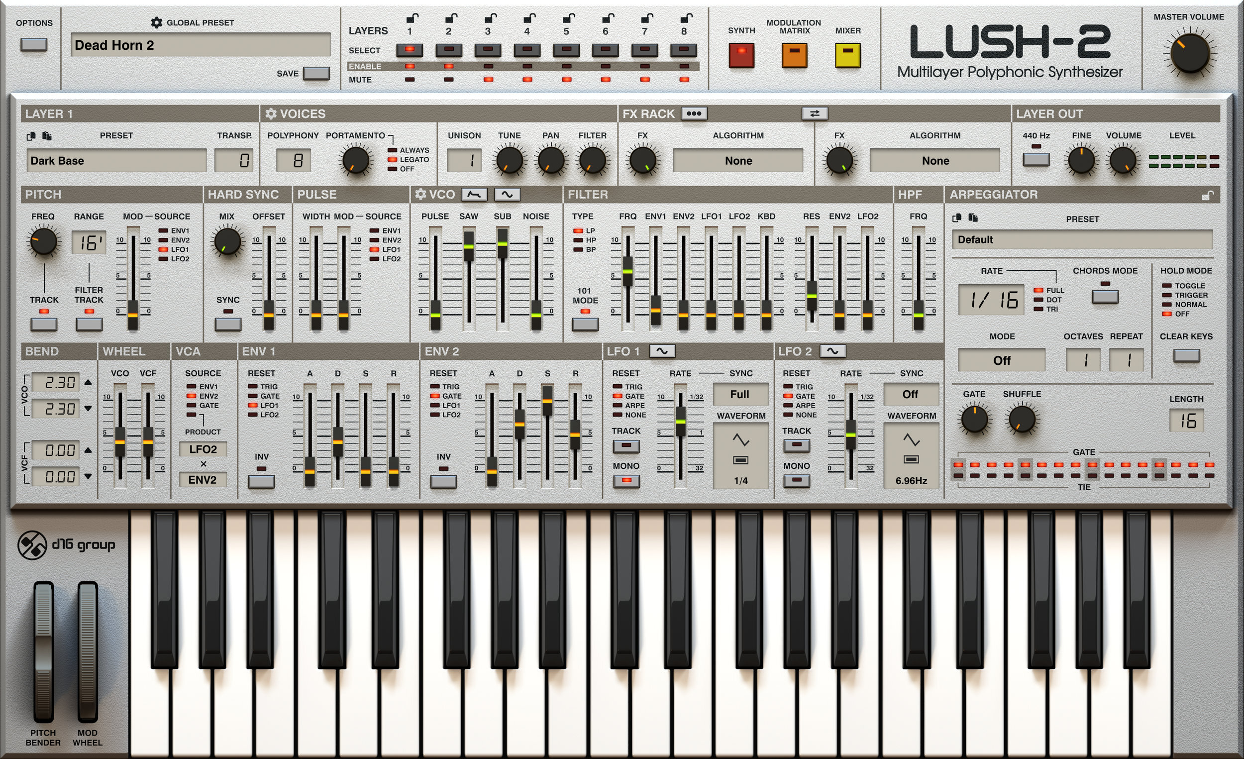 Lush 2 讓你達到「前所未聞」的創意層次——每一層都像獨立的合成器,擁有自己的多聲部、參數、增強的琶音效果,以及八種最優秀的插入效果器中可選。