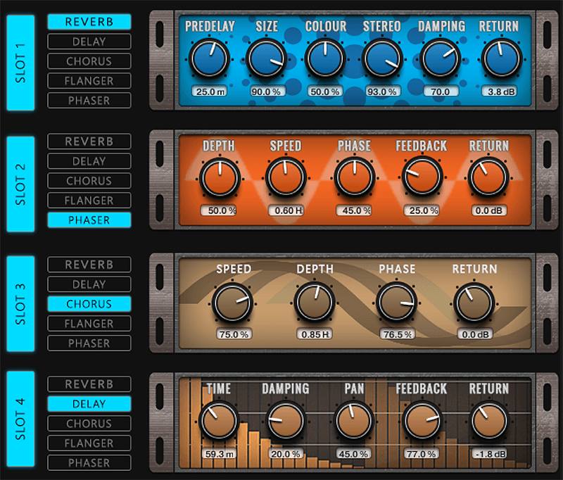 每個插槽可選擇 5 種效果(如混響、延遲等),每個聲源可獨立發送至任意效果槽,快速切換效果而無需重新配置。