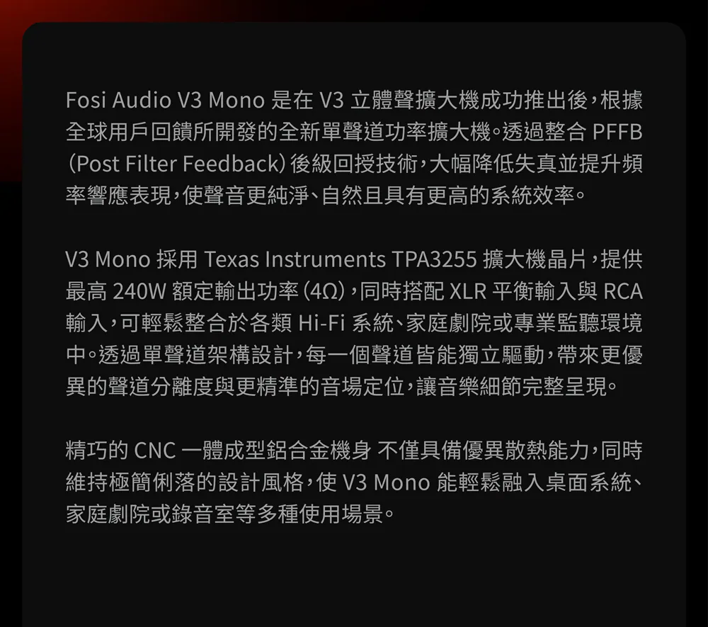 Fosi Audio V3 Mono 單聲道功率擴大機