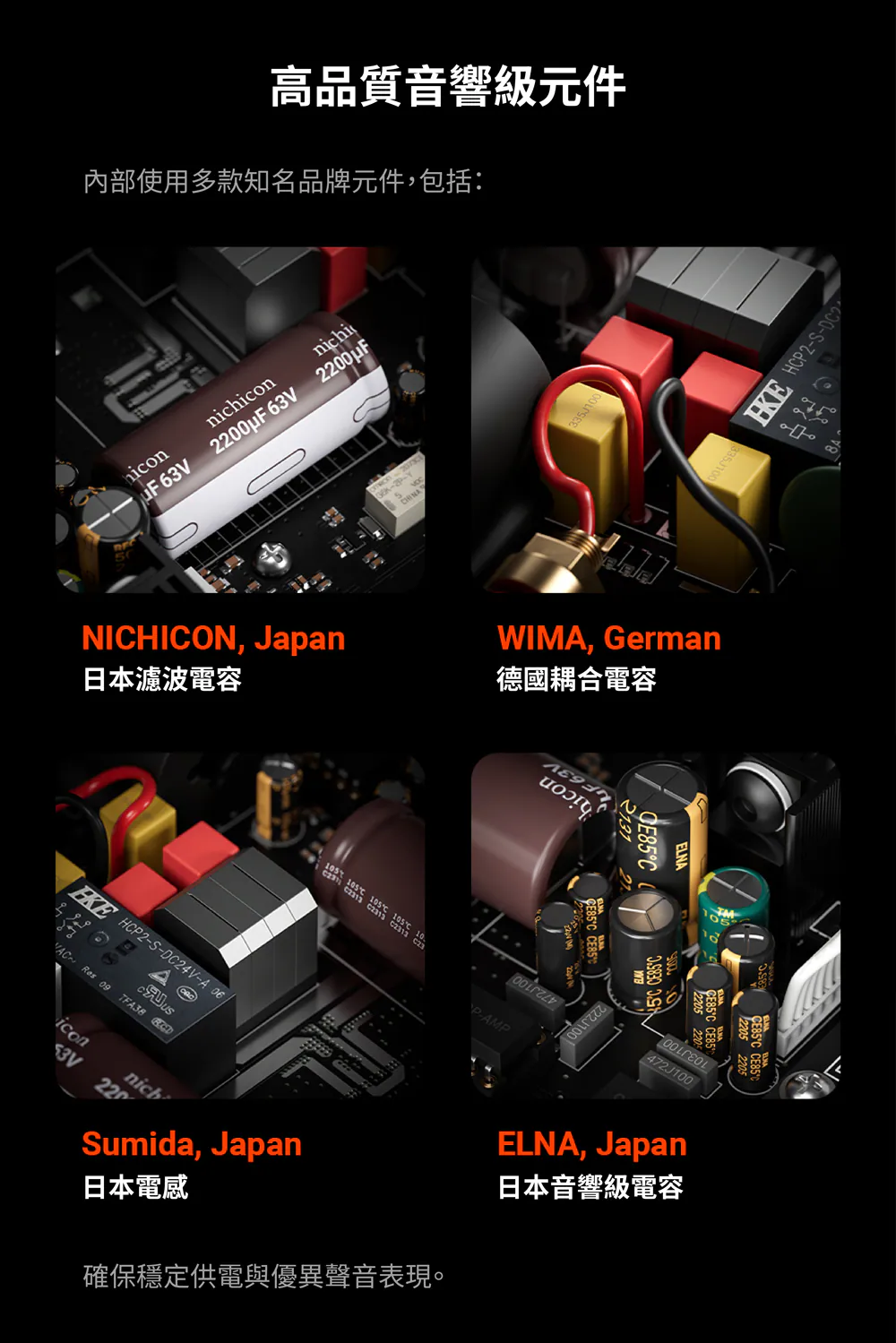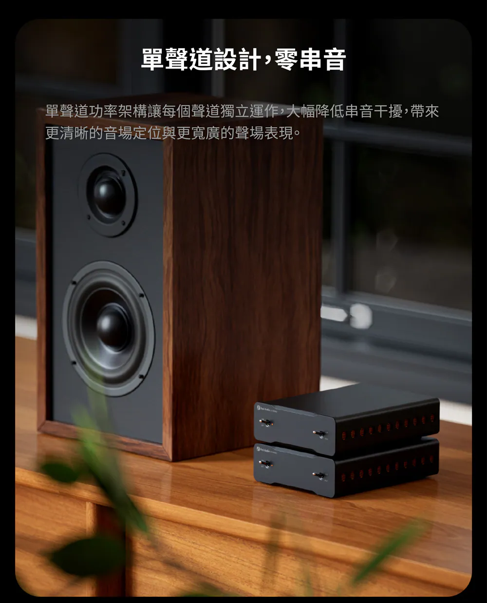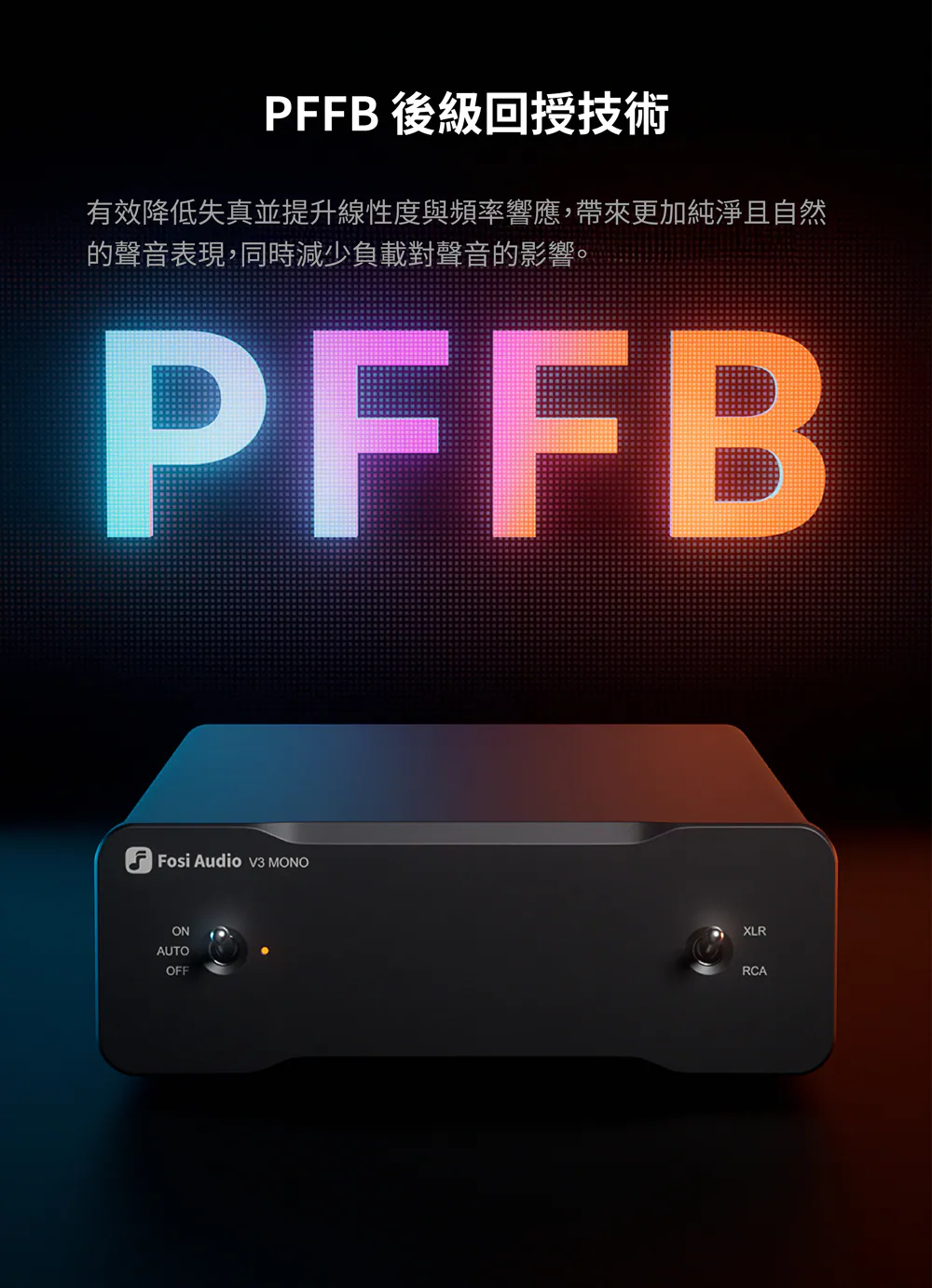 ▲核心技術:搭載 PFFB(濾後回饋)技術,解決 D 類放大器對負載依賴的問題,大幅降低失真並提升線性度。