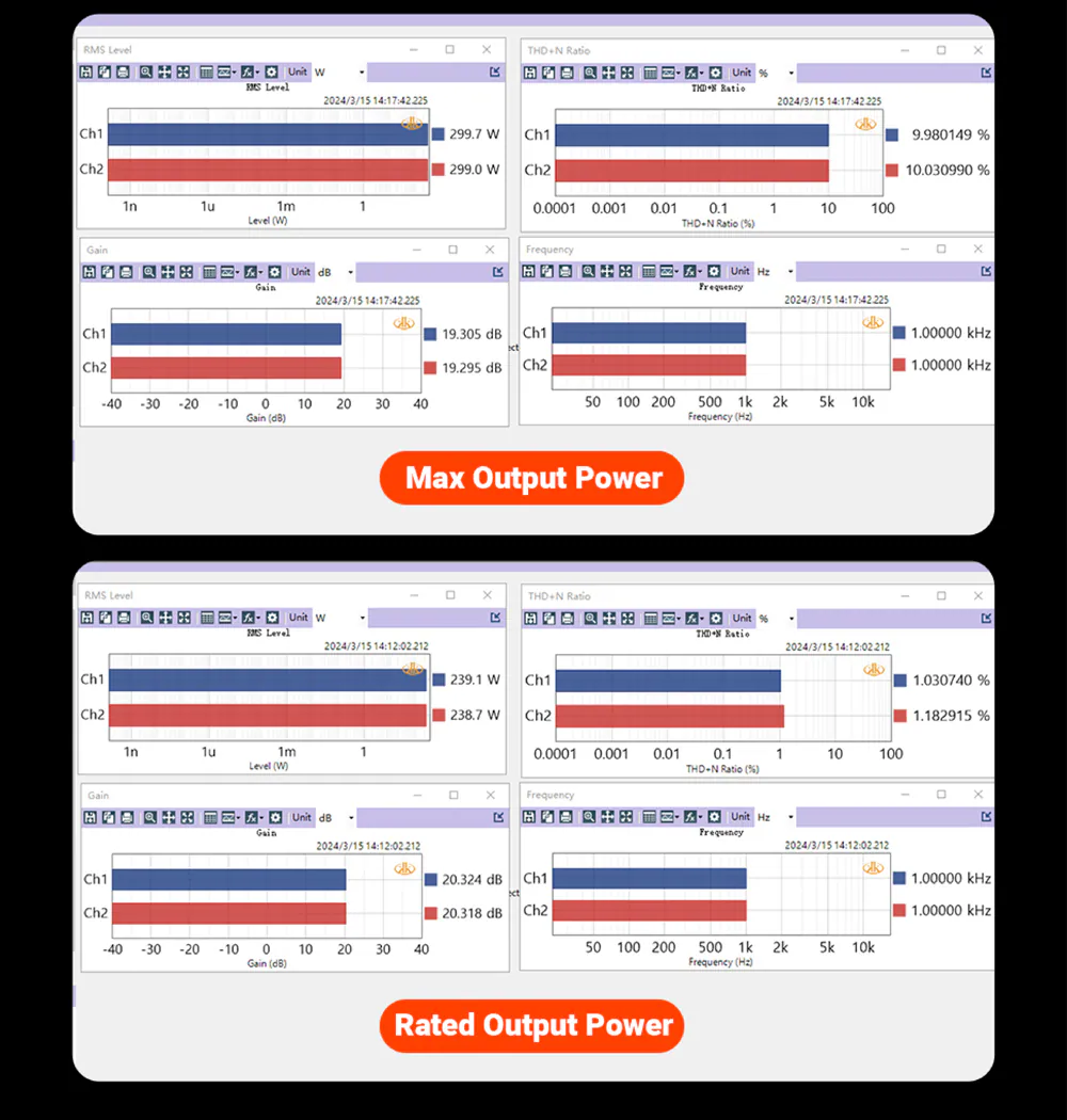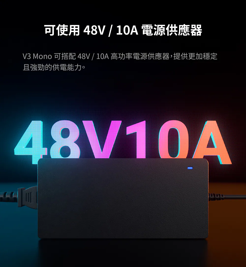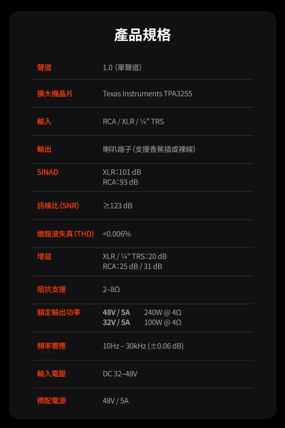 ▲輸出功率:搭配 48V/5A 電源時可達 240W @4Ω。