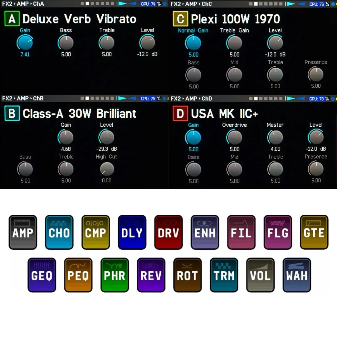 ●音箱模式:四組腳踏切換聲道、Gain Boost、104 組預設
