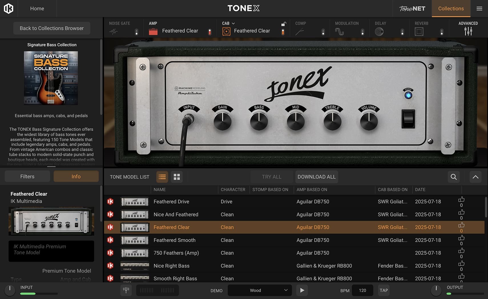 預設分為 50 個音色庫,每個音色庫以一款傳奇貝斯音箱為核心,並提供 3 種 Tone Model 選擇。另有 15 種內建效果可用於強化或自訂任何 Tone Model,為任何曲風提供近乎無限的音色可能。