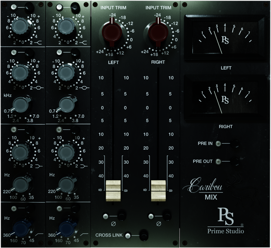 Prime Studio® Caribou Mix 是一款真正的立體聲插件,具備可獨立調整的三頻段均衡器、低切濾波器與前級擴大功能。您可以透過 Pre-In 與 Pre-Out 控制,結合輸入 Trim 旋鈕與推桿,自由設定輸入與輸出放大器階段的諧波失真,打造理想的音色效果。