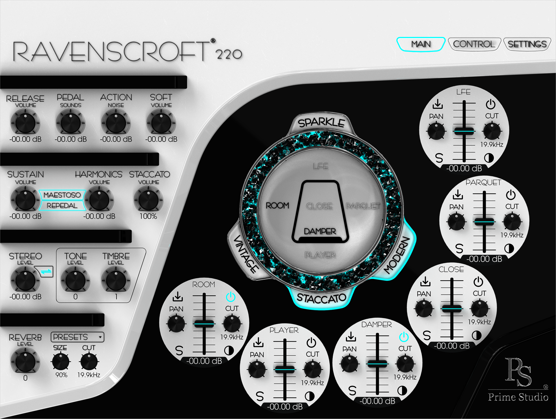 虛擬樂器內含真實延音踏板取樣、動作與踏板音效,支援 Continuous MIDI 控制器以操作 Una Corda、Sostenuto 與 Sustain 踏板。透過 "Harmonics" 功能加入完整取樣的泛音共鳴。六種不同麥克風位置共提供 11 軌麥克風訊號,讓您自由混音出最愛的音色。選擇「Parquet」並搭配「LFE」麥克風位置,加上立體聲耳機,可帶來雙耳聽覺體驗。對於實驗性玩家來說,Ravenscroft 220 VI 也提供斷奏取樣。