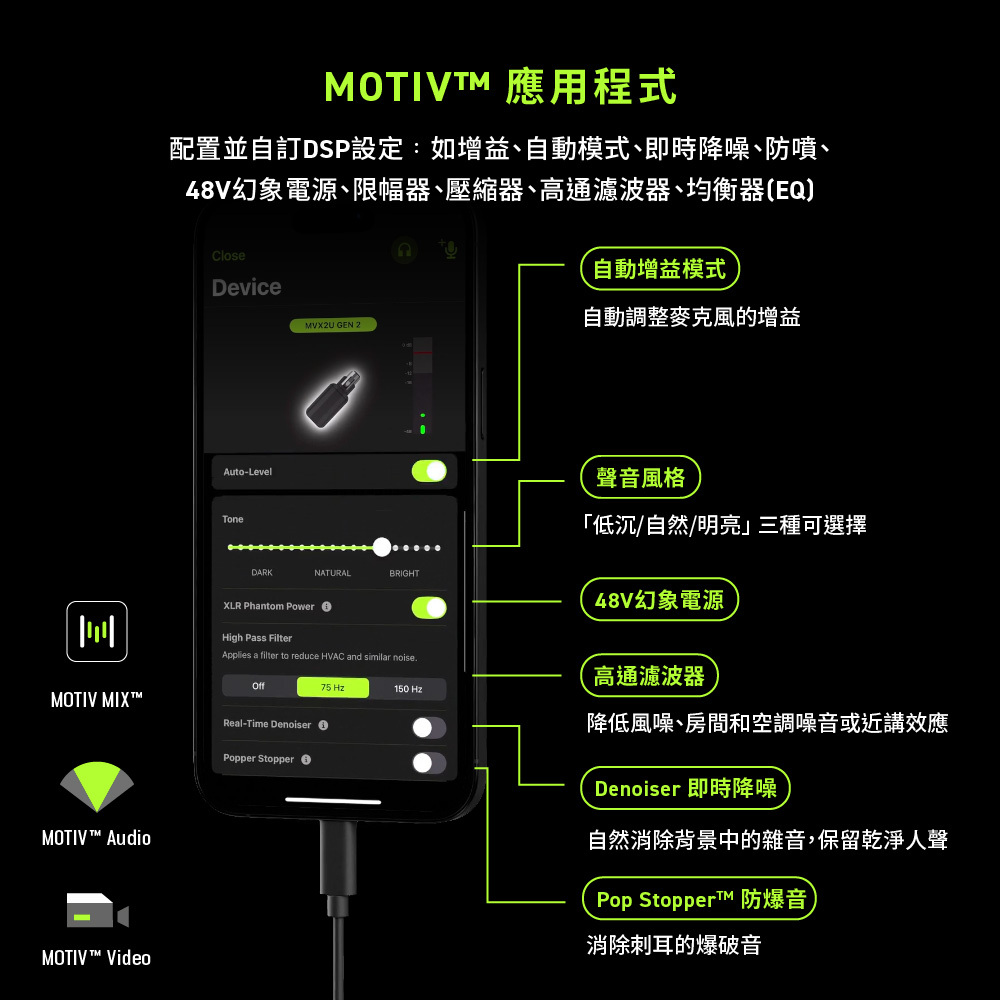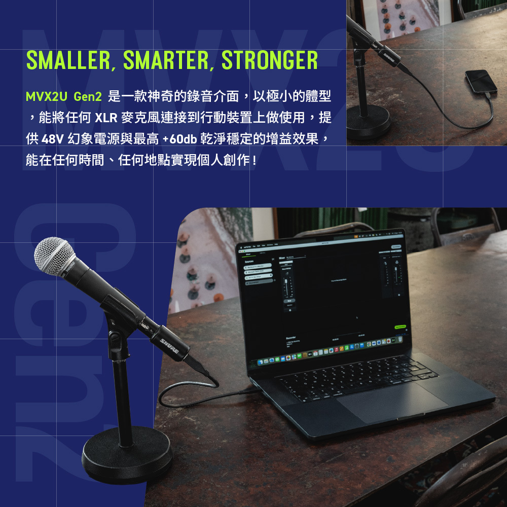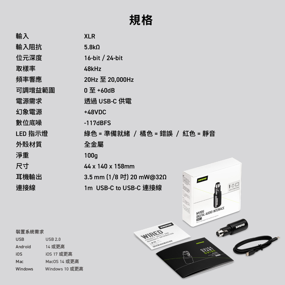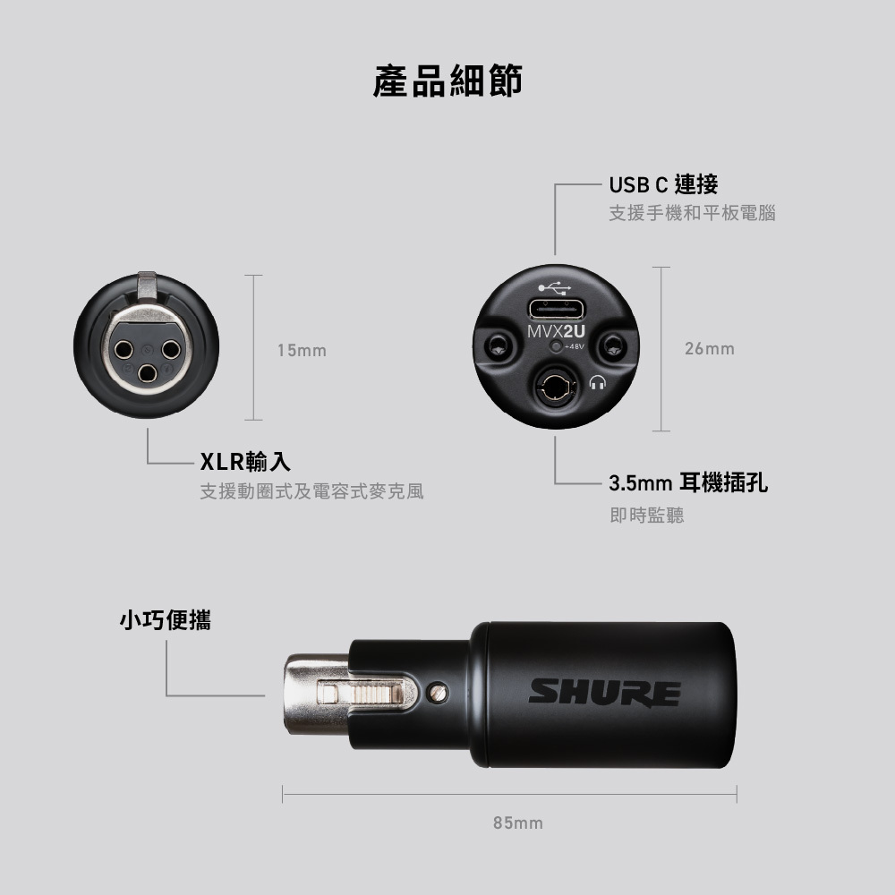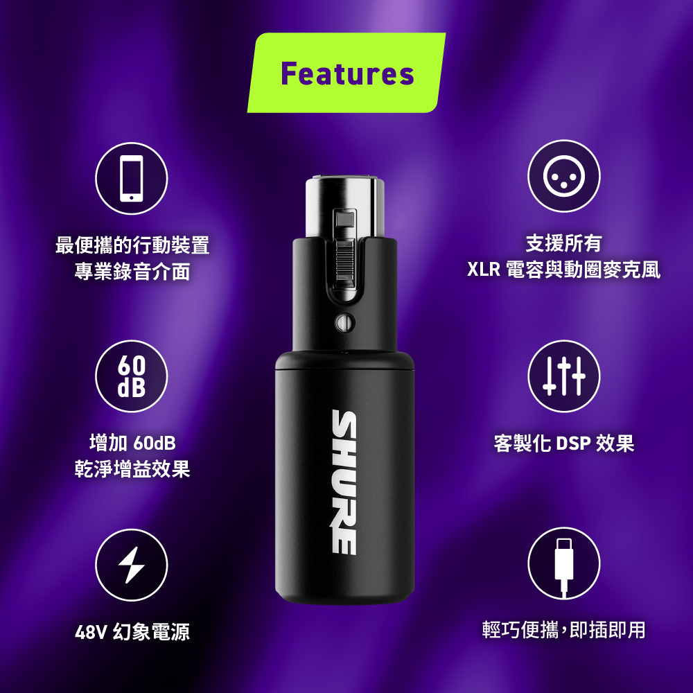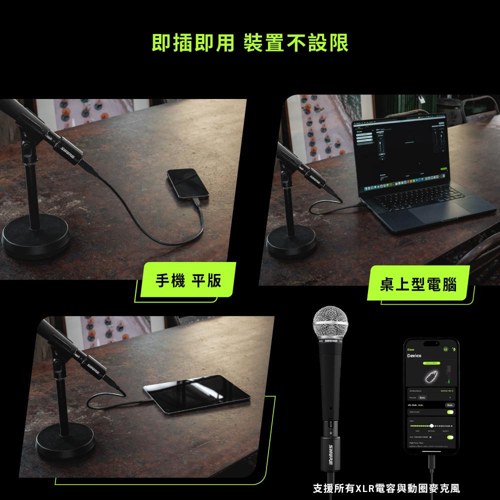 一款緊湊便攜的單通道XLR 轉USB 接口,專為在桌上型電腦或行動裝置上使用任何XLR 麥克風進行錄音或直播而設計。內建數位音訊處理技術,透過USB-C 供電,確保在不同設備間以及不理想的聲學環境下都能保持一致的音質。可為動圈和電容XLR 麥克風提供高達60 dB 的增益和48 V 的幻象電源。獲得MFi 認證,適用於iPhone 和iPad,並相容於部分Mac、Windows、iOS 和Android 裝置。