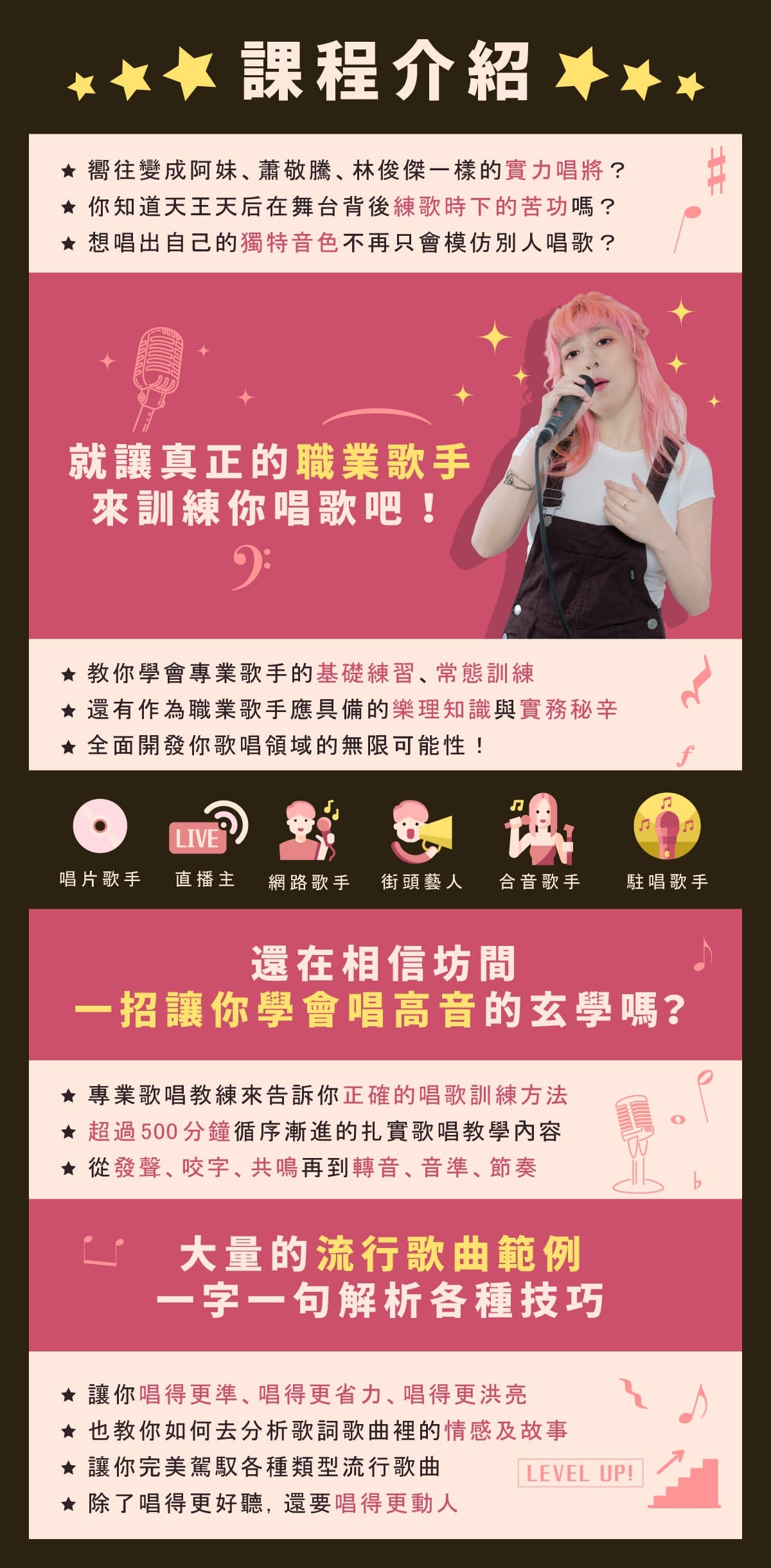 ※大量流行歌曲演唱示範、字句解析各種歌唱技巧