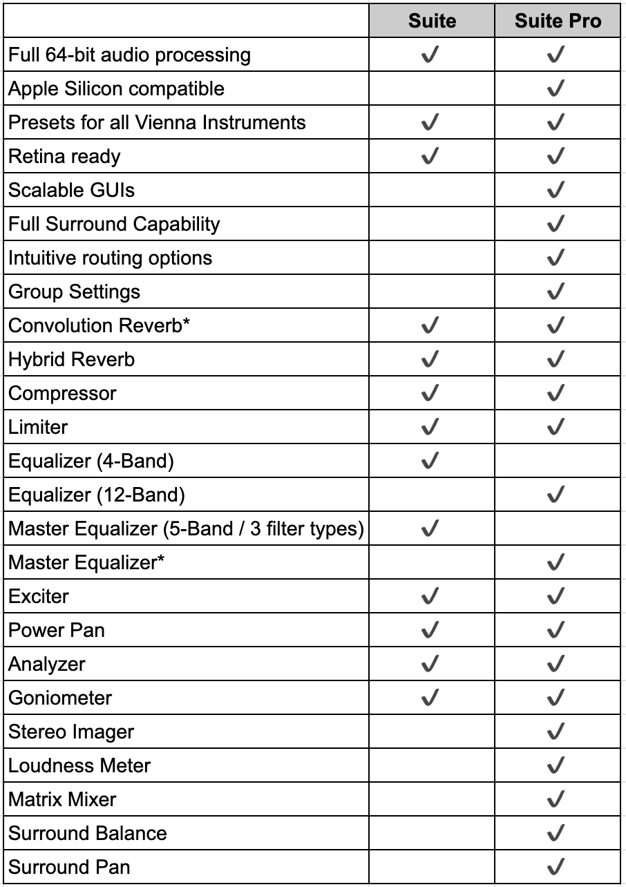Vienna Suite 為原始的僅支援立體聲版本,包含十一款 64 位元音訊處理插件,但不支援 Apple Silicon。