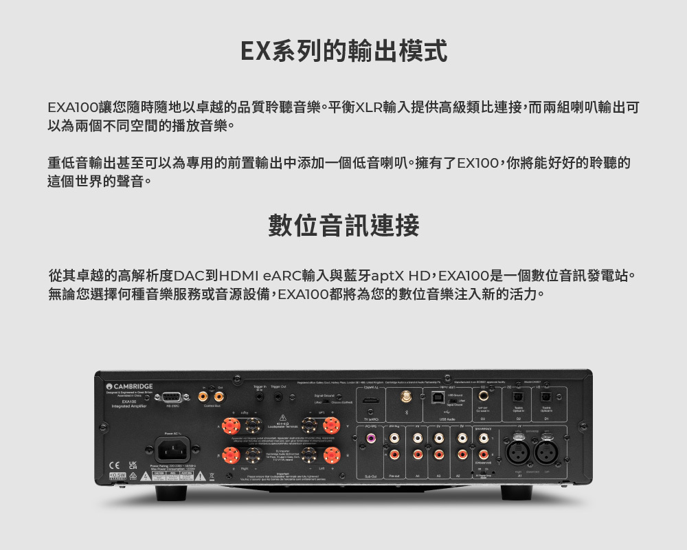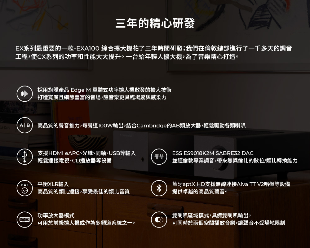 EXA100 配備高解析度 DAC、HDMI eARC 音訊回傳,以及 aptX HD 藍牙技術,無論音源來自黑膠、電視還是手機,都能瞬間提升聲音層次,全面釋放每段聲音的動人魅力。