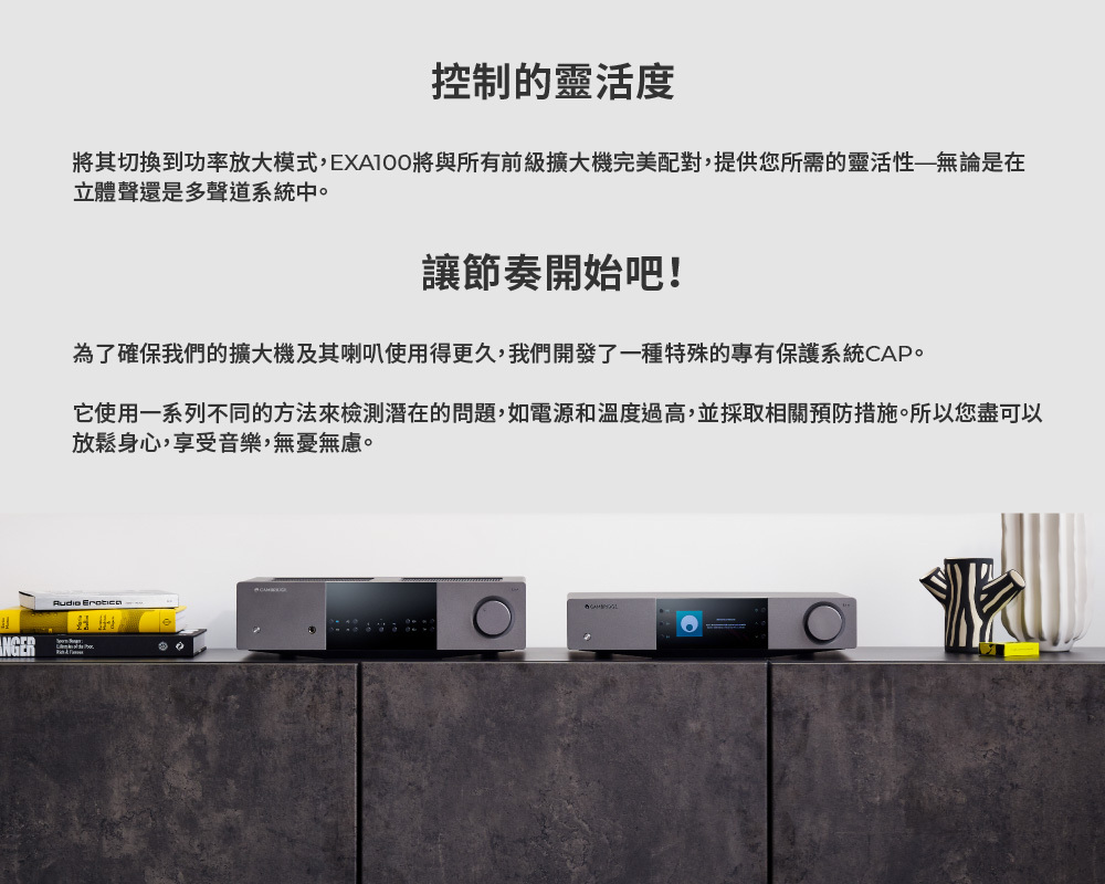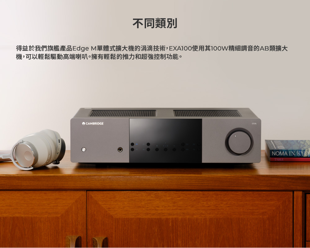 EXA100 採用源自旗艦單聲道放大器 Edge M 的先進技術,搭載精心調校的 100 瓦 Class AB 放大技術,足以輕鬆驅動各類高階揚聲器,帶來強勁而細緻的聲音表現。