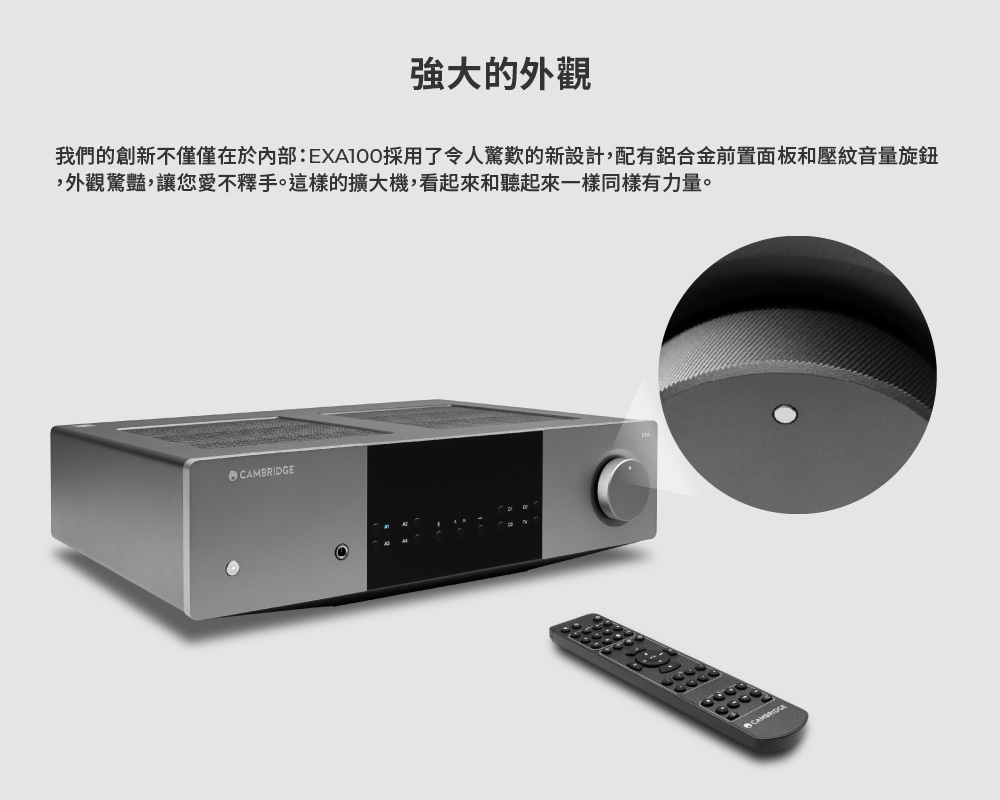 EXA100 不只是為聲音而設。機身正面採用精密切割的鋁合金面板,配合細緻紋理的旋鈕設計,每個細節都展現出與聲音表現同樣強悍的質感和格調。
