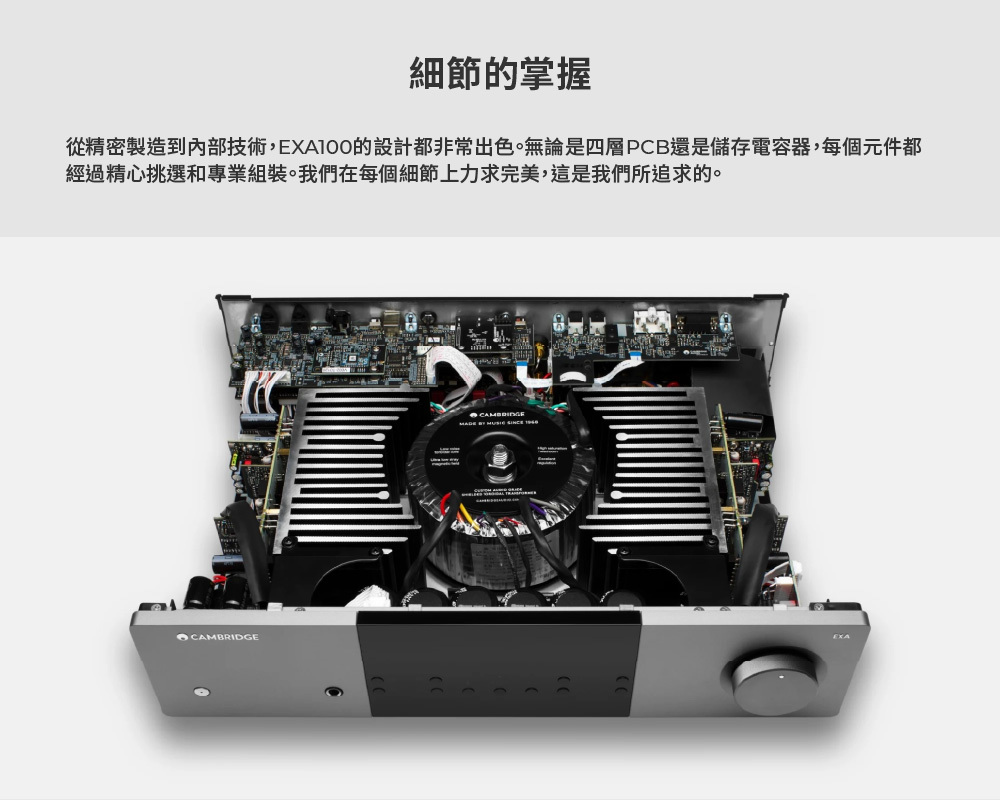 EXA100 採用特選濾波電容,確保穩定供電和大電流輸出,讓放大器在動態及低頻控制上更顯從容不迫。